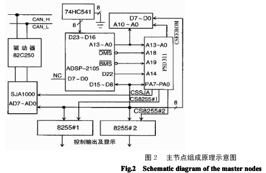 系統(tǒng)主節(jié)點(diǎn)結(jié)構(gòu)原理圖,如圖 2 所示。 中央處理器采用美國模擬器件公司生產(chǎn)的 ADSP2105。它是一種高性價(jià)比、性能成熟的 DSP 器件, 在一個(gè) 100ns 周期內(nèi),可以完成如下操作:取兩個(gè)操作數(shù),修改指向操作數(shù)的地址單元,使兩個(gè)操作數(shù)相乘 并將結(jié)果累加到一個(gè) 40 位的和中。由于程序循環(huán)在硬件內(nèi)完成,所以每 100ns 能執(zhí)行一次這些高級指令 的操作。WSI 的 PSD311 可編程外圍器件有效地將可編程邏輯、I/O 端口和存儲器集成在一塊芯片上,可 以實(shí)現(xiàn)本系統(tǒng)的外圍功能。ADSP2105 在與 PSD311 等外圍器件聯(lián)絡(luò)方面提供了很大的時(shí)序靈活性。它 可以為 4 個(gè)分開的存儲器空間中的每一個(gè)單獨(dú)分配等待狀態(tài)數(shù)量,以適應(yīng)很寬的時(shí)序差別。我們在 ADSP2105 的 “ 等待寄存器”為 EPROM、RAM 和外部存儲器的選通脈沖安排 1 個(gè)等待狀態(tài),即 200ns 周期 時(shí)間,以滿足 PSD311 120ns 器件的時(shí)序要求。由于總線的通路布在 ADSP2105 的里面,PSD311 的數(shù)據(jù)線 與 D15~D8 連接。ADSP2105 的 “ D22”線提供 PSD311 的 “ A14”地址線,BMS(Boot Memory Select)充當(dāng) EPROM 的片選并與 PSD311 的 “ A19”輸入相連接。 選用 SJA1000 作為 CAN 控制器,驅(qū)動(dòng)器使用 CAN 控制器接口芯片 PCA82C250。EEPROM 用作數(shù)據(jù) RAM,用于保存設(shè)置輸入的關(guān)鍵數(shù)據(jù),以防掉電時(shí)丟失。