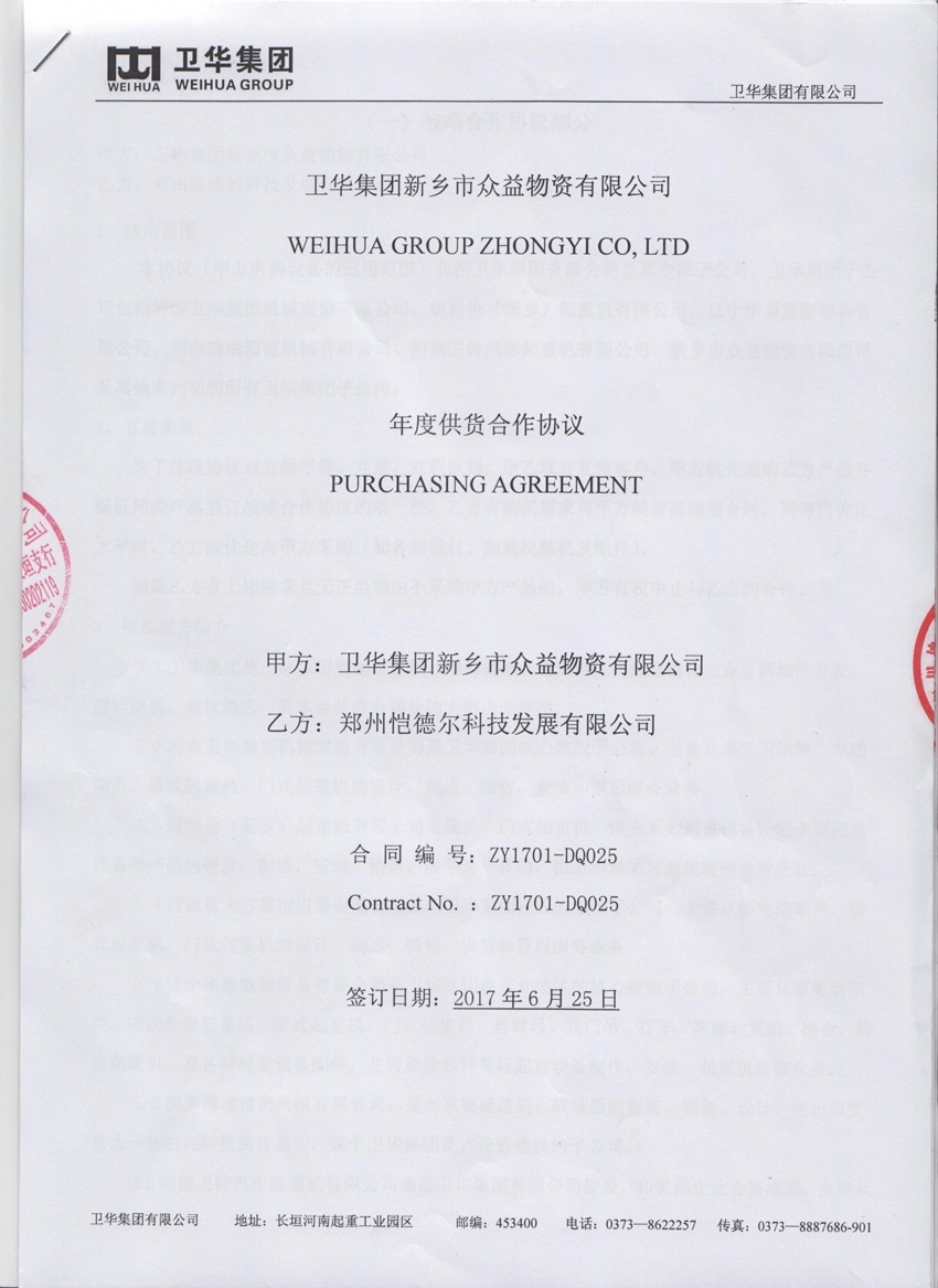 2017年6月25日,鄭州愷德爾科技發展有限公司在新鄉市與衛華集團新鄉市眾益物資有限公司簽訂了年度供貨合作協議。標志著兩大企業的戰略合作關系持續深化。公司與新鄉市眾益物資有限公司2014年正式確立合作關系后,以精準的服務、精細的管理,努力打造新型高端客戶關系。公司積極構建集“生產+銷售+質量+研發”于一體的新型營銷組織模式,由生產、銷售、質量、技術人員組成大客戶經理服務團隊走進市場一線,為客戶提供一站式優質服務。隨著公司服務水平不斷提升,營銷渠道進一步完善,雙方相互信任度逐步加深,供貨方式發生了“質”的變化。